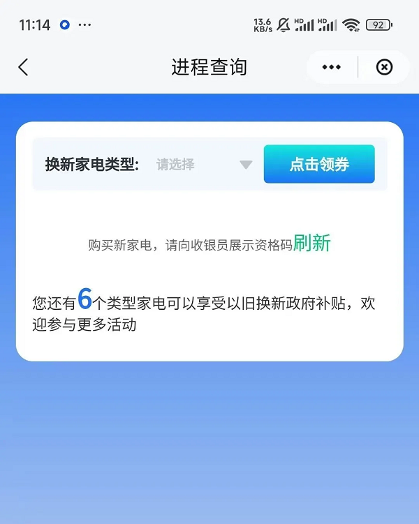 系統(tǒng)校驗(yàn)用戶的以舊換新資格,校驗(yàn)成功后,彈窗提示,用戶點(diǎn)擊確認(rèn),進(jìn)入領(lǐng)券界面,在“換新家電類型”的下拉框中選擇要領(lǐng)券的品類,點(diǎn)擊領(lǐng)券。頁(yè)面彈窗提示:“確認(rèn)要領(lǐng)取該類型的政府補(bǔ)貼券嗎?領(lǐng)取成功后將無(wú)法修改!”,點(diǎn)擊確定。領(lǐng)券成功,界面顯示以舊換新資格碼。